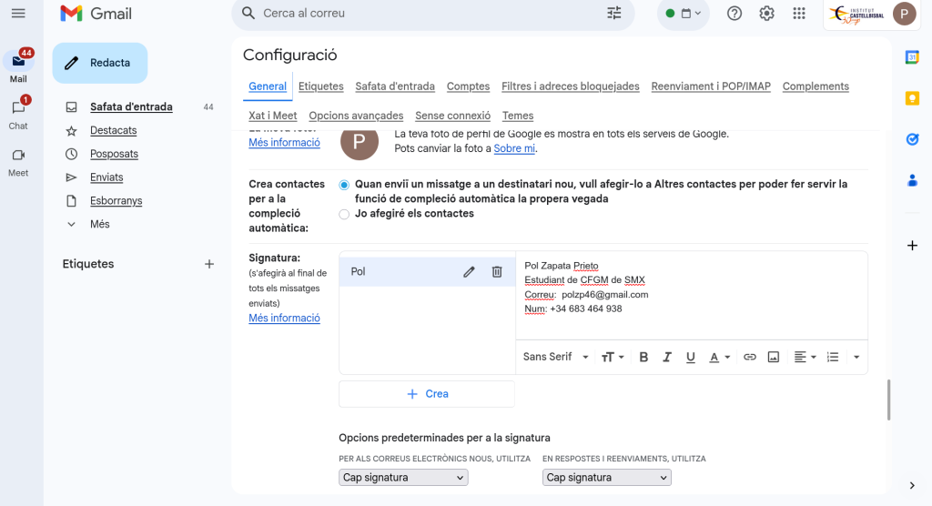 Un cop aquí, creem la nostra signatura i desem els canvis.