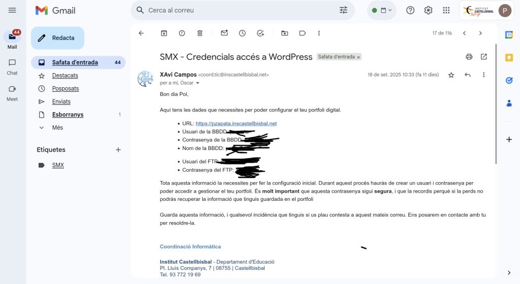 Per poder instal·lar WordPress, vam rebre un correu electrònic amb totes les nostres dades d’accés.